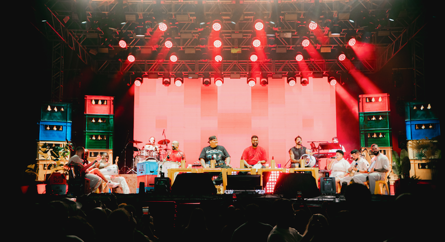 No palco, essa ideia ganha forma logo de cara. O Menos é Mais foge da tradicional “caixa preta” ao apostar em cenário claro, leve e cheio de identidade. Tons de bege dominam o espaço, enquanto diferentes níveis para os músicos ampliam a visibilidade e aproximam ainda mais o público. Nos conteúdos de LED, referências como “caquinhos” de botequim e azulejos inspirados na arquitetura popular — com conexão à obra de Athos Bulcão — reforçam essa estética brasileira. Para equilibrar, elementos orgânicos como plantas, cadeiras e caixas de cerveja coloridas, inspirados no “Churrasquinho Menos é Mais”, entram em cena e ajudam a contar a história do show.